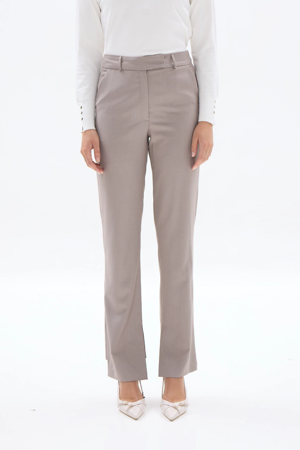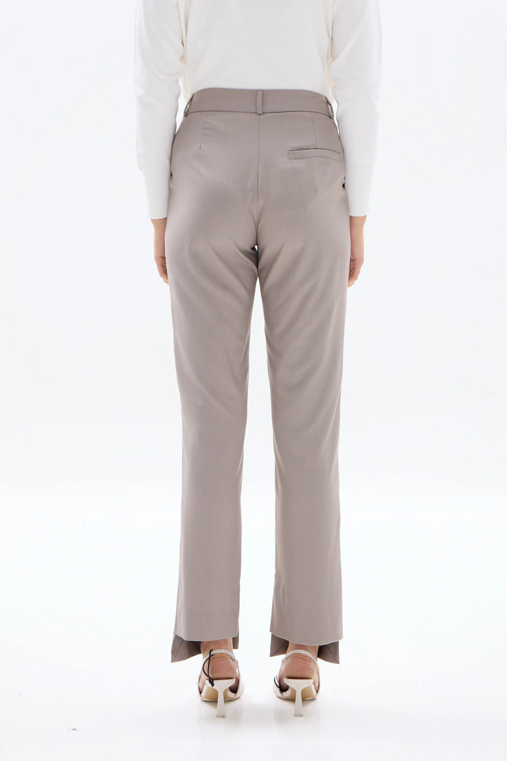 Pantalon sastrero con tiro alto con bolsillos y diferencias de largo en ruedo de espalda. Cierre en bragueta y boton interno.