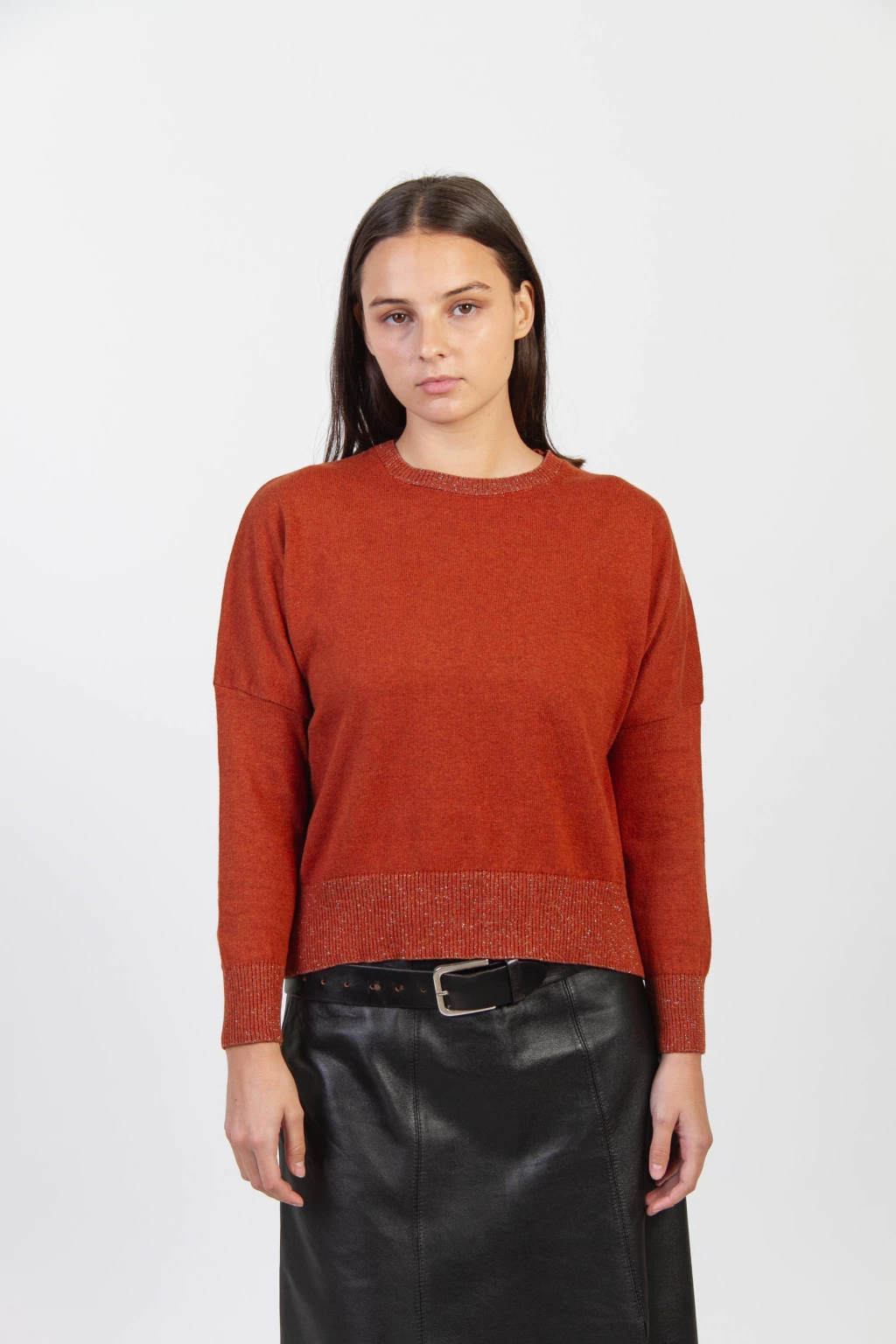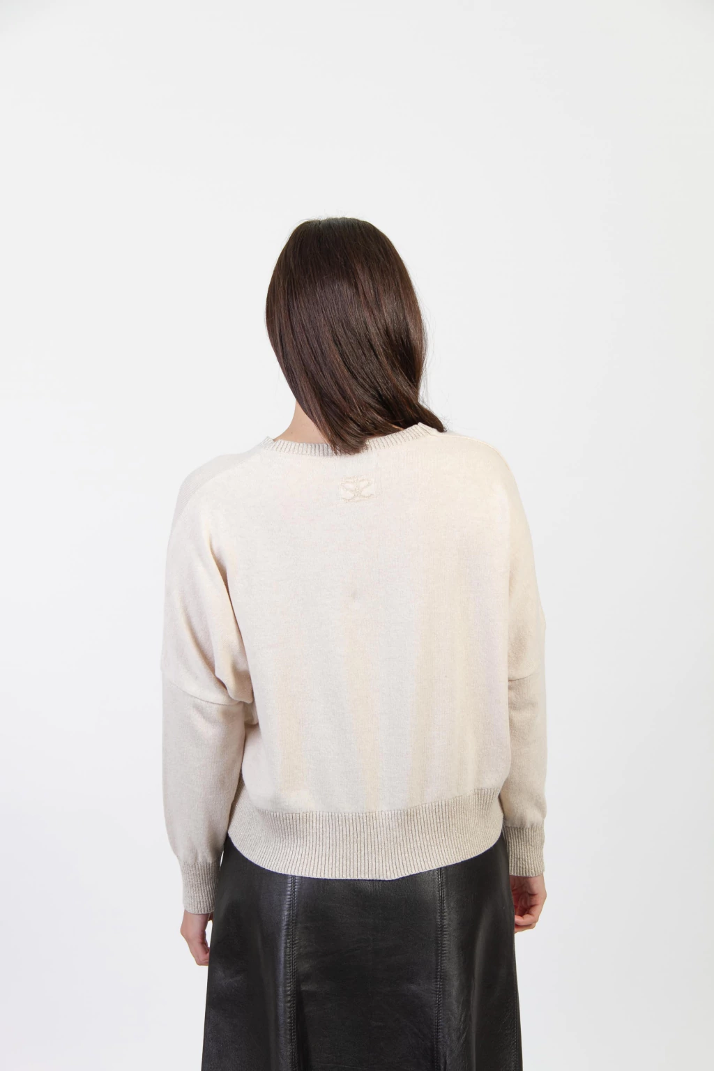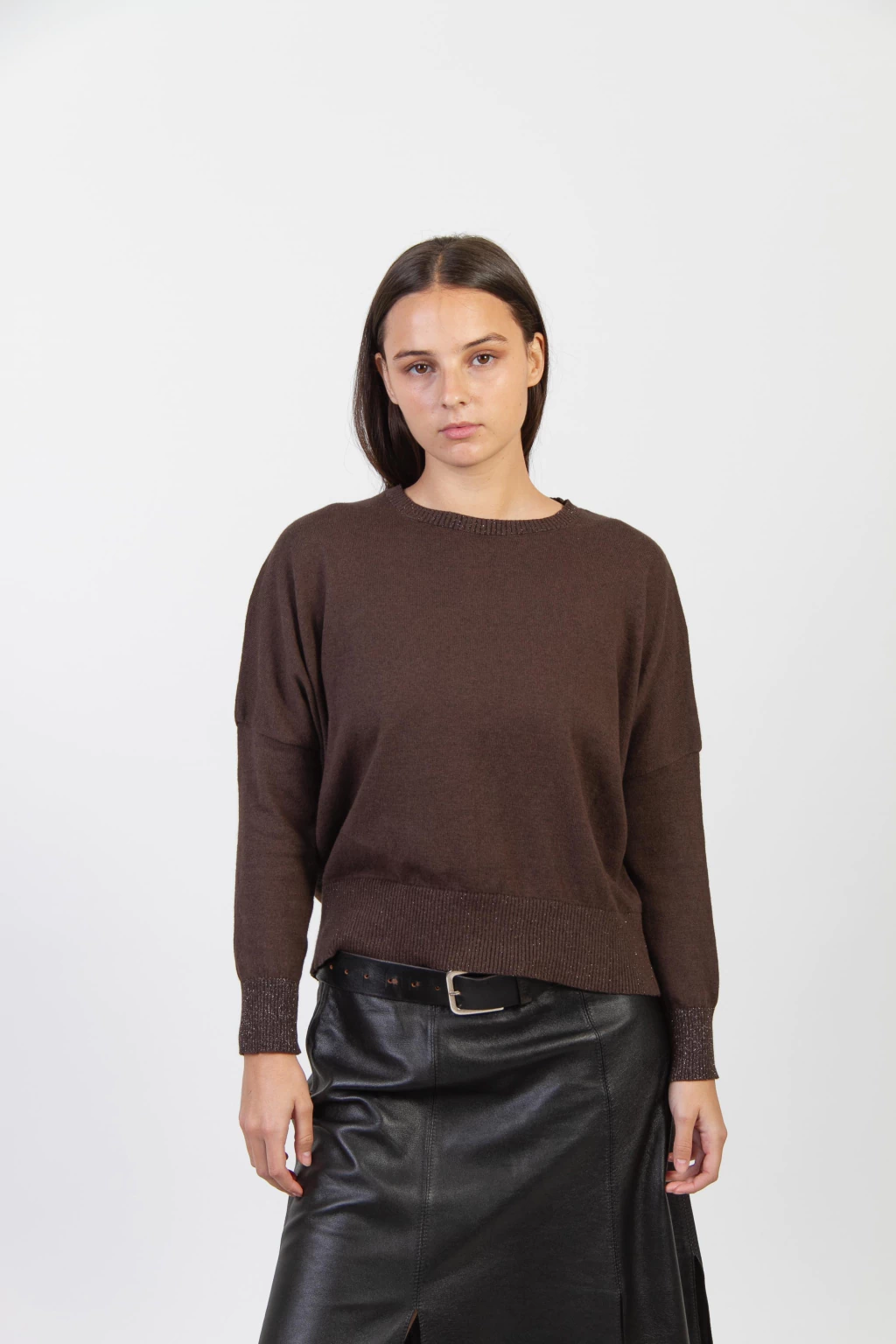 Sweater tejido en punto jersey con terminaciones de rib con hilo de lurex. de calce amplio. Largo por debajo de la segunda cadera.