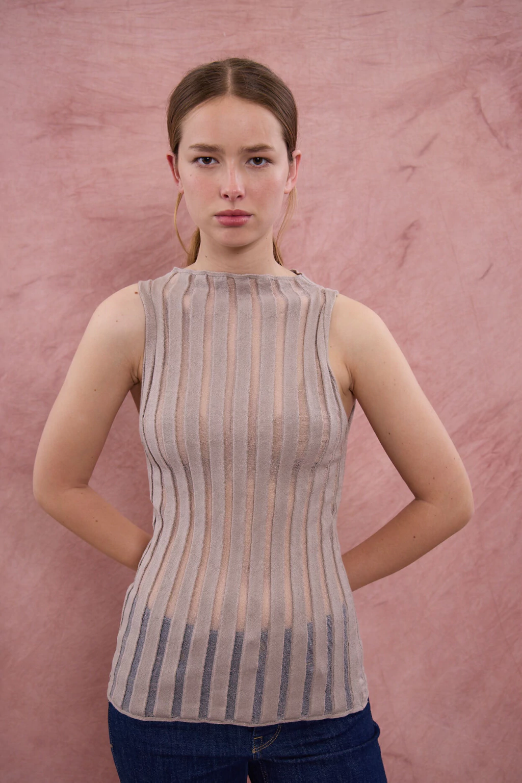 Top tejido con punto morley en viscosa con lurex. Cuello alto. Largo hasta la primera cadera.Composición:70% VISCOSA -30%POLIAMIDA