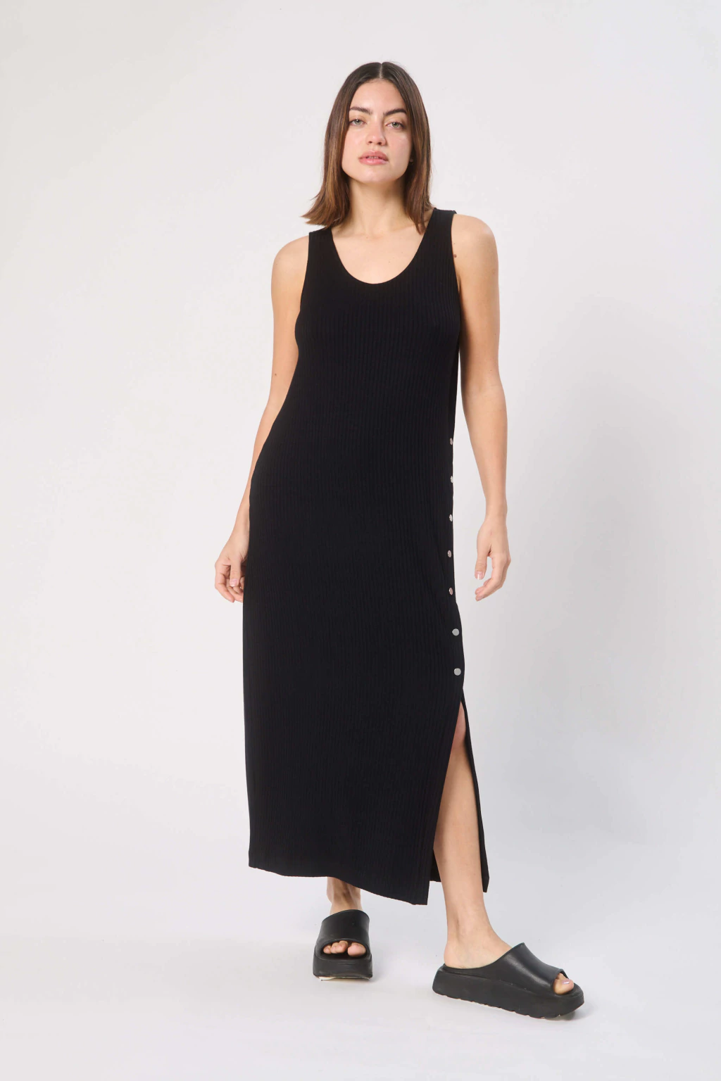 Vestido confeccionado en morley. Tiene tajos laterales con broches para utilizarlo abieto o cerrado. Largo hasta los tobillos.